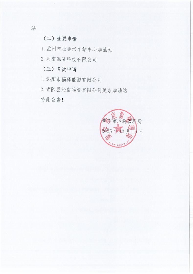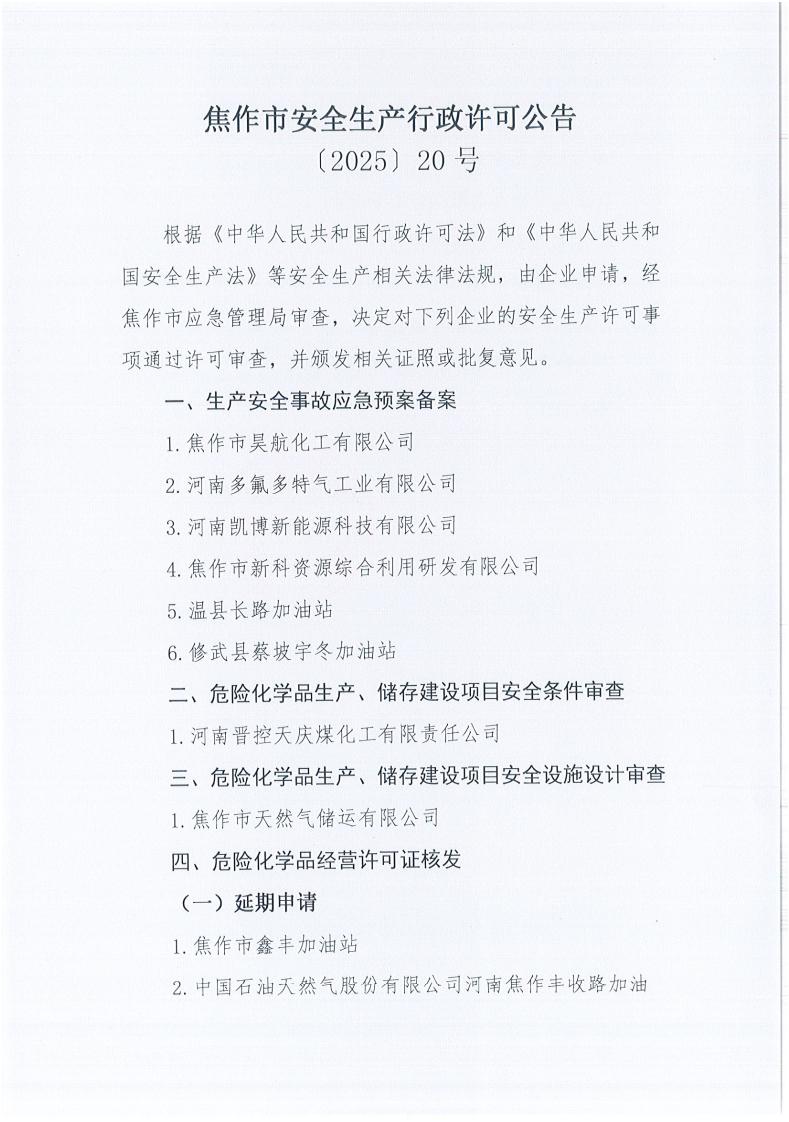 焦作市安全生产行政许可公告(〔2025〕20号)