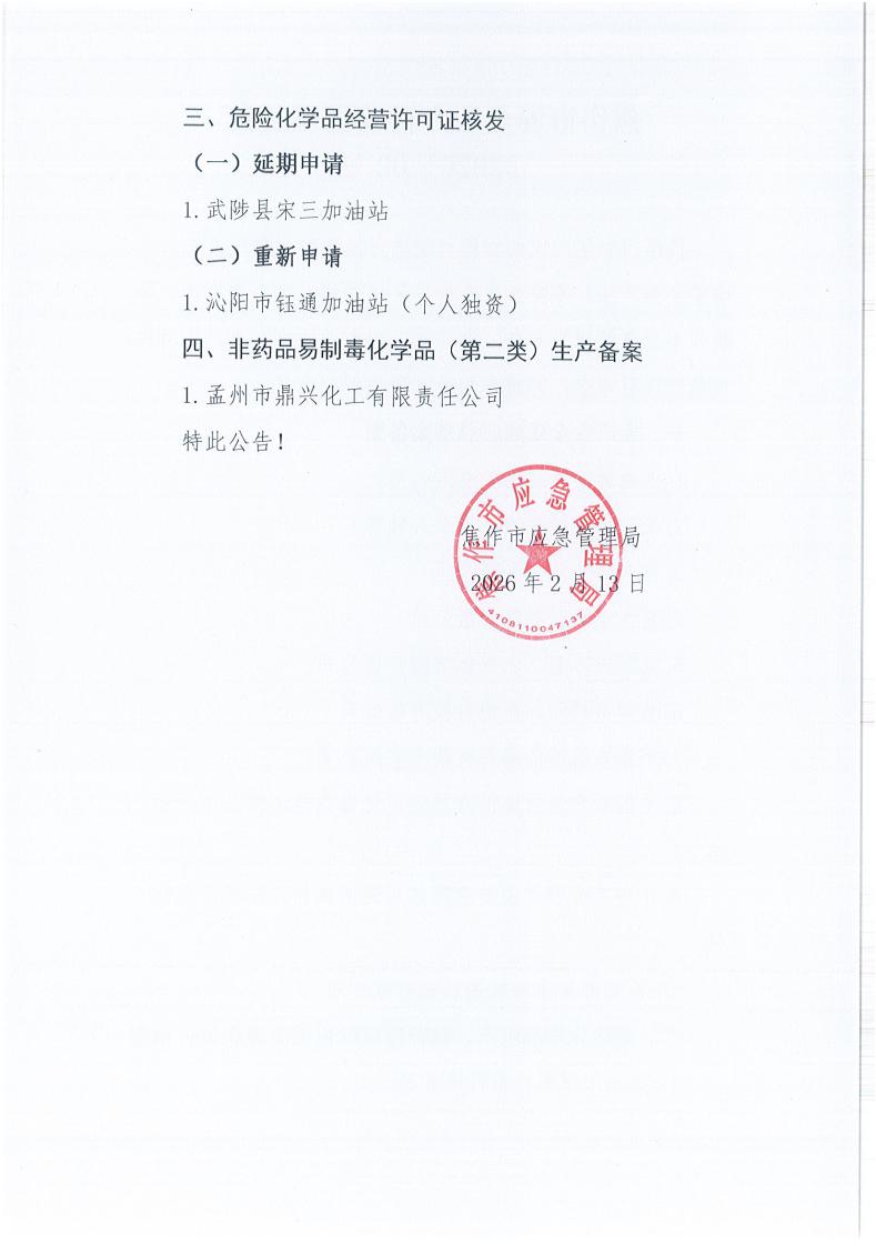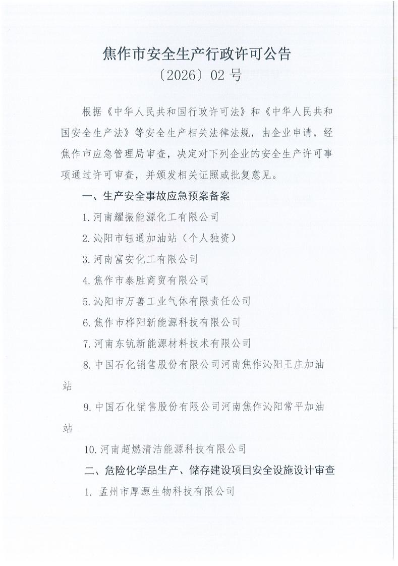 焦作市安全生产行政许可公告(〔2026〕2号)